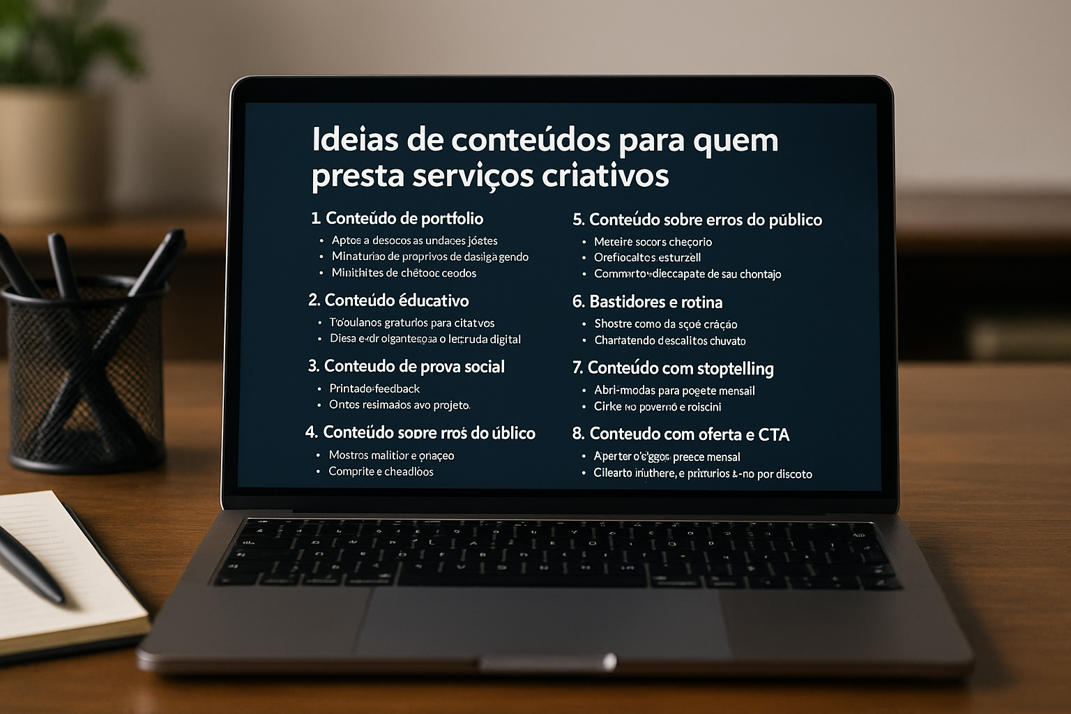 Se você trabalha com serviços criativos — como design, tráfego pago, produção de conteúdo, criação de sites ou marketing digital — precisa alimentar suas redes com conteúdo que atraia, posicione e converta. A dúvida é: o que postar? Neste artigo, você vai encontrar ideias de conteúdos criativos, estratégicos e que geram engajamento, mesmo se você estiver começando ou com poucos seguidores. Por que criar conteúdo é essencial para serviços criativos? Gera visibilidade constante para o seu serviço Mostra sua autoridade e diferencial Cria conexão com o público ideal Educa seu cliente sobre o valor do que você oferece Facilita o fechamento de vendas sem forçar Se você não aparece, não vende. E conteúdo é a melhor forma de estar presente sem parecer insistente. Como organizar suas ideias de conteúdo Antes de sair criando, divida seus temas em pilares. Isso vai te ajudar a manter variedade e consistência. Exemplos de pilares…